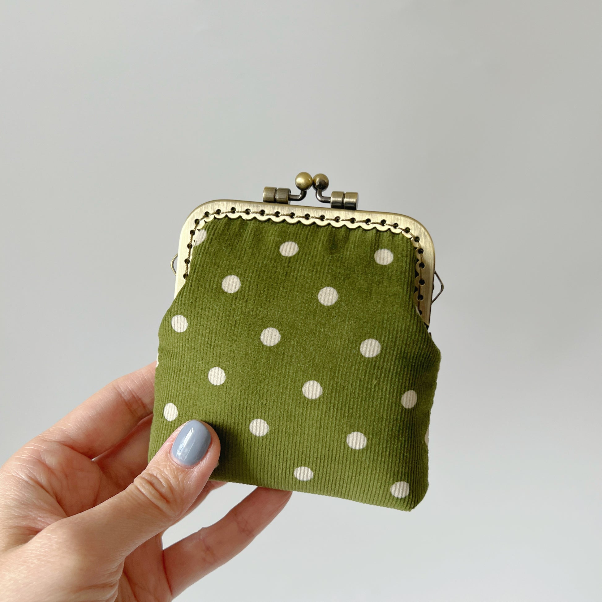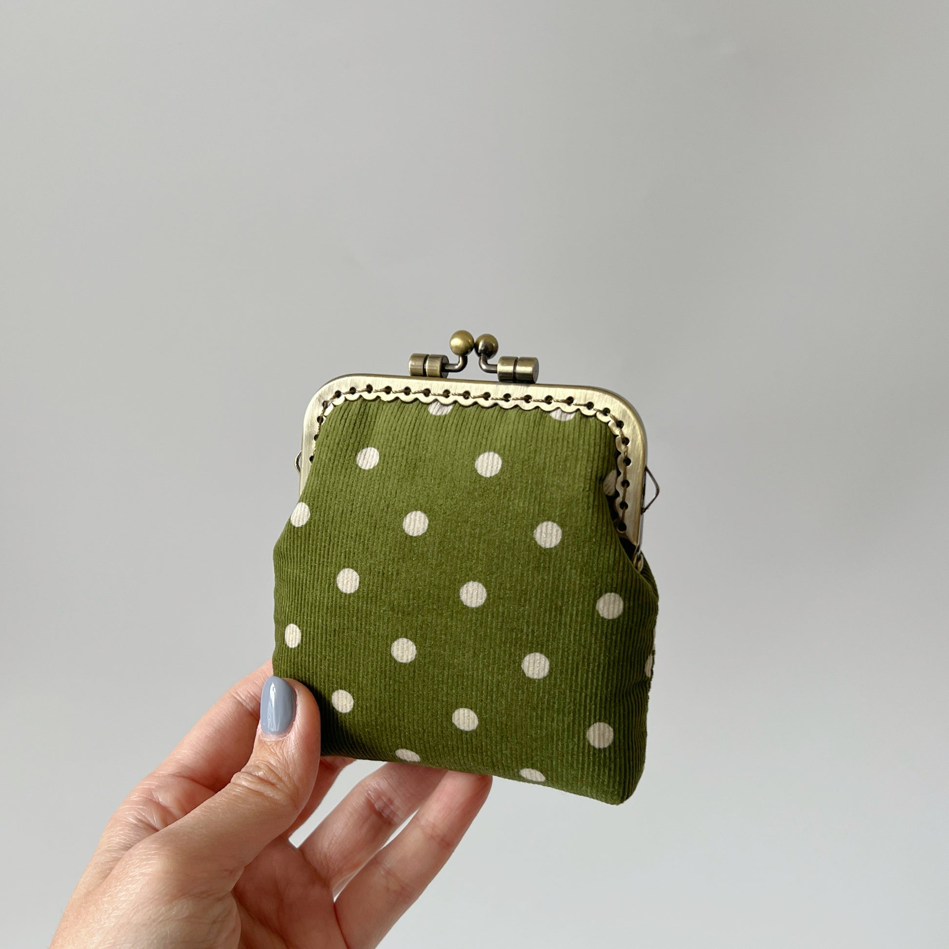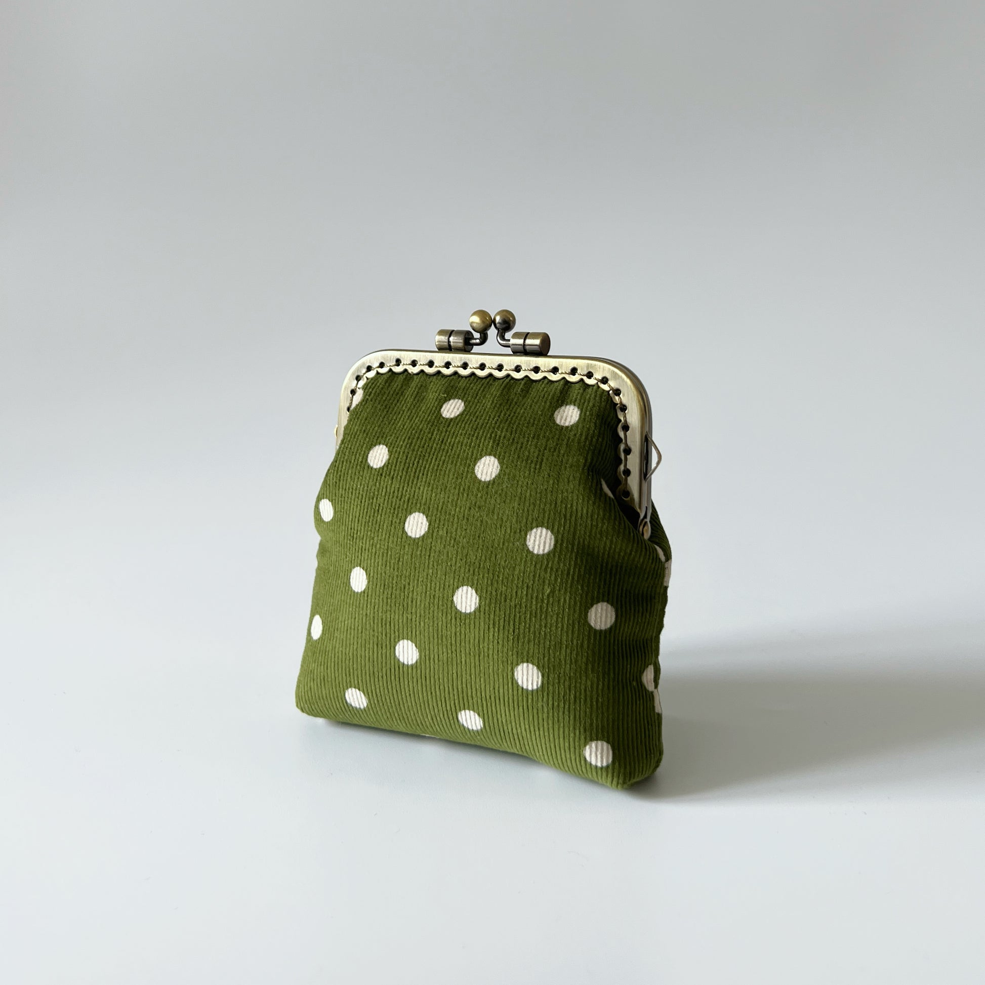 Olive Green Corduroy Polka Dots Card Purse - Handsewn Kiss Lock Purse