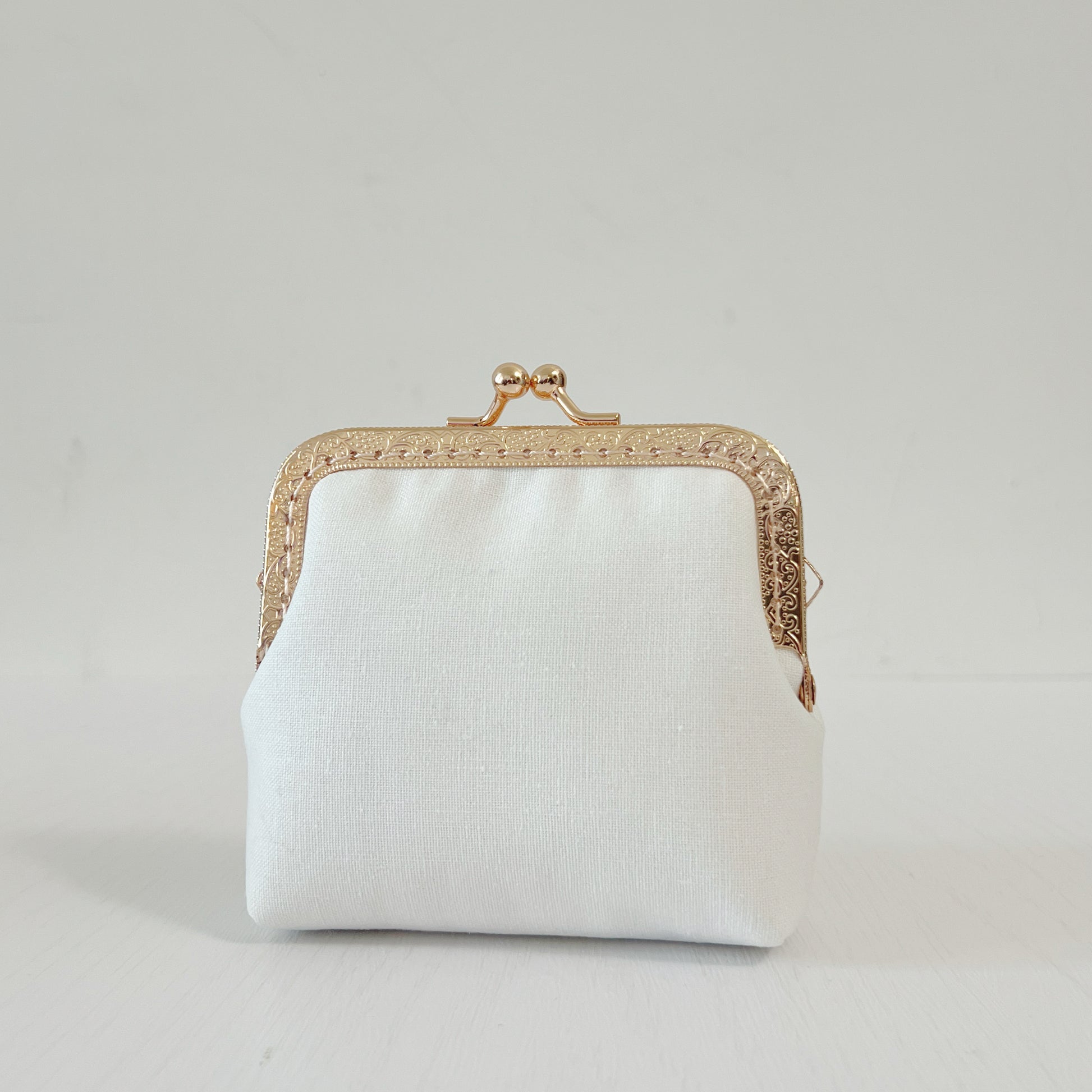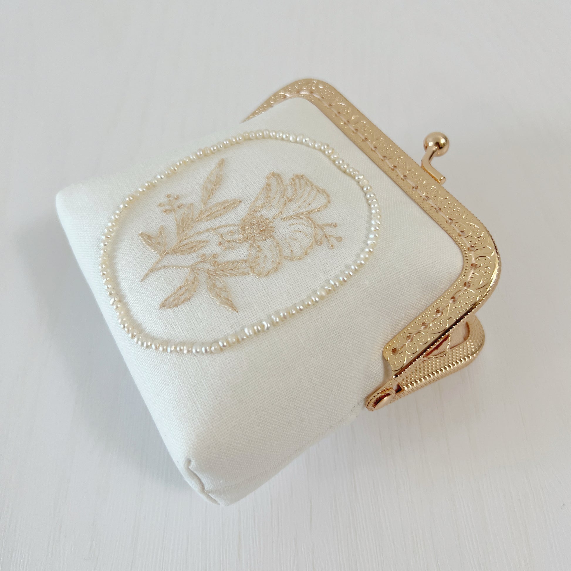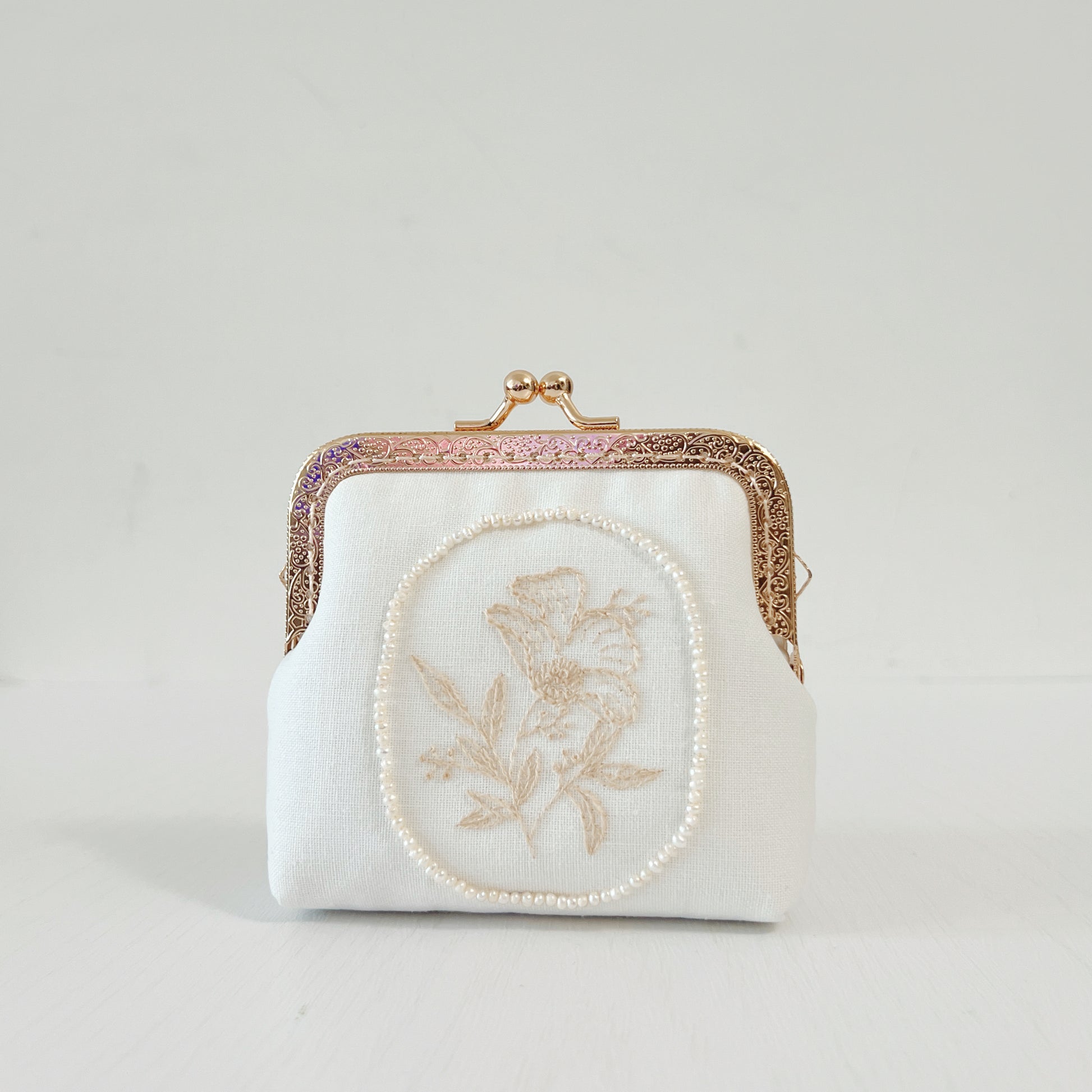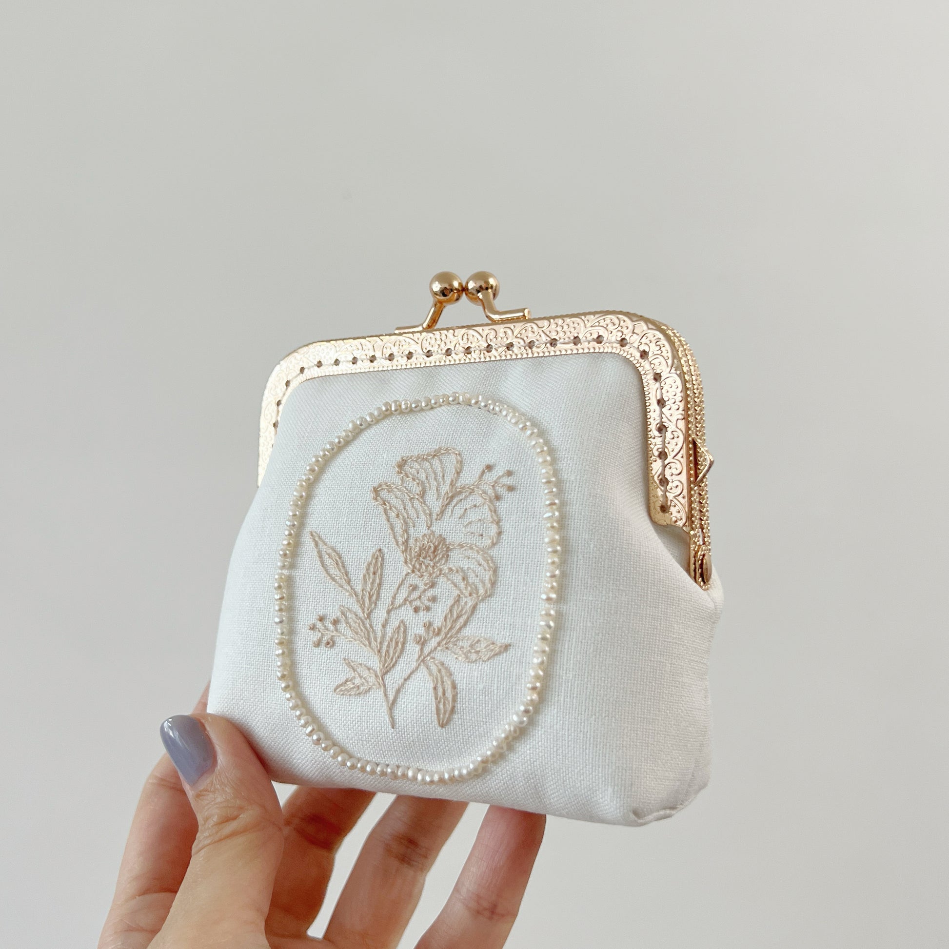 Handmade Embroidered Kiss Lock Card Purse - White Embroidery and Pearls